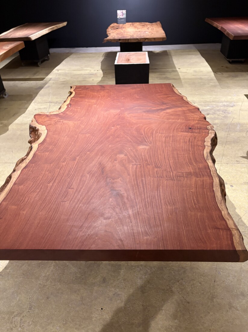 心材(濃い部分)と辺材(薄い部分)のコントラストが強く、一枚板家具に特に人気があります。