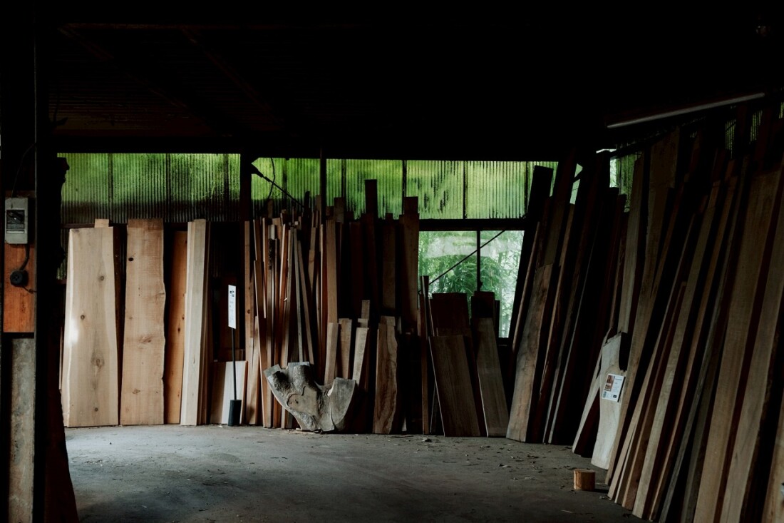 岐阜県中津川市付知町の全国から入荷した約1000枚の「未仕上材」の素材が見られる、rewoodの倉庫です。