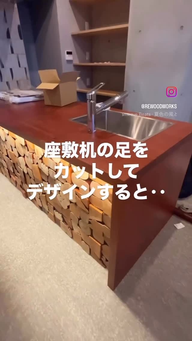 使われていたケヤキ材。一枚板の座敷机を天板に使った洗面台。